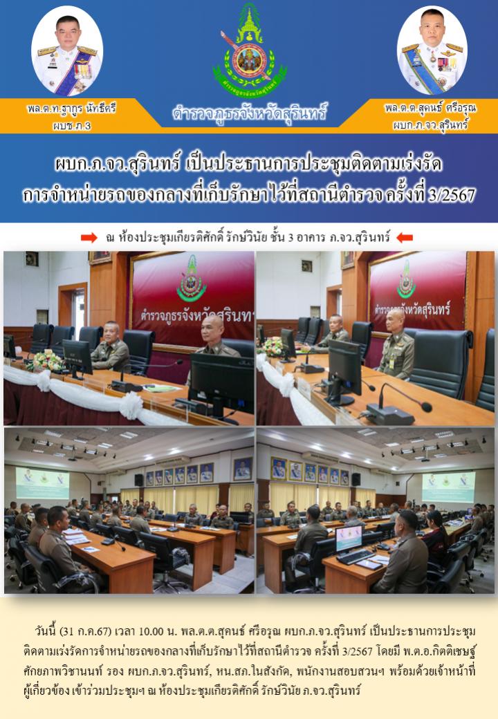 31 ก.ค. 2567 11:54:05ผบก.ภ.จว.สุรินทร์ เป็นประธานการประชุมติดตามเร่งรัด การจำหน่ายรถของกลางที่เก็บรักษาไว้ที่สถานีตำรวจ ครั้งที่ 3/2567 วันนี้ (31 ก.ค.67) เวลา 10.00 น. พล.ต.ต.สุคนธ์ ศรีอรุณ ผบก.ภ.จว.สุรินทร์ เป็นประธานการประชุมติดตามเร่งรัดการจำหน่ายรถของกลางที่เก็บรักษาไว้ที่สถานีตำรวจ ครั้งที่ 3/2567 โดยมี พ.ต.อ.กิ...