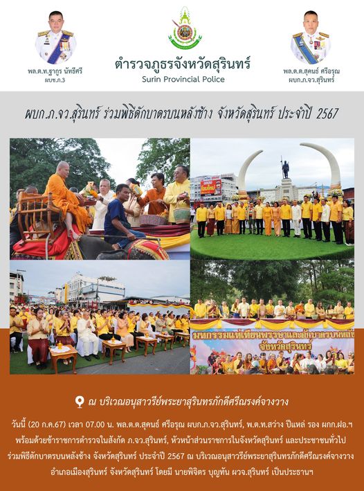 20 ก.ค. 2567 16:11:31 ผบก.ภ.จว.สุรินทร์ ร่วมพิธีตักบาตรบนหลังช้าง จังหวัดสุรินทร์ ประจำปี 2567 วันนี้ (20 ก.ค.67) เวลา 07.00 น. พล.ต.ต.สุคนธ์ ศรีอรุณ ผบก.ภ.จว.สุรินทร์, พ.ต.ท.สว่าง ปีแหล่ รอง ผกก.ฝอ.ฯ พร้อมด้วยข้าราชการตำรวจในสังกัด ภ.จว.สุรินทร์, หัวหน้าส่วนราชการในจังหวัดสุรินทร์ และประชาชนทั่วไป ร่วมพิธีตักบาตรบน...