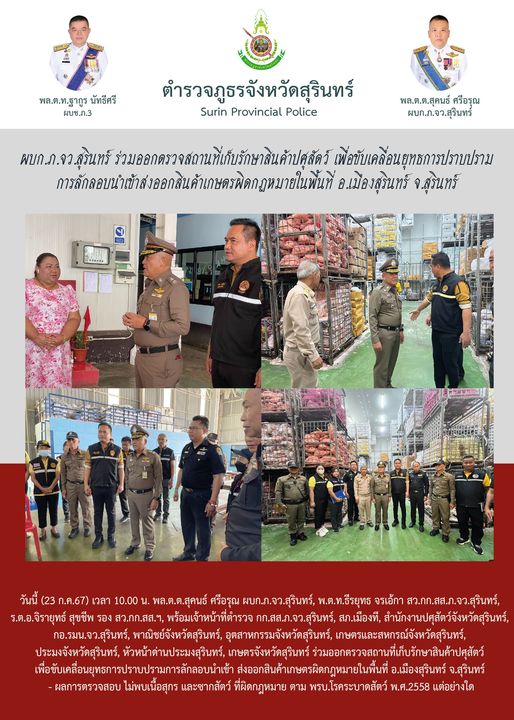 23 ก.ค. 2567 13:50:49ผบก.ภ.จว.สุรินทร์ ร่วมออกตรวจสถานที่เก็บรักษาสินค้าปศุสัตว์ เพื่อขับเคลื่อนยุทธการปราบปราม การลักลอบนำเข้าส่งออกสินค้าเกษตรผิดกฎหมายในพื้นที่ อ.เมืองสุรินทร์ จ.สุรินทร์ วันนี้ (23 ก.ค.67) เวลา 10.00 น. พล.ต.ต.สุคนธ์ ศรีอรุณ ผบก.ภ.จว.สุรินทร์, พ.ต.ท.ธีรยุทธ จรเอ้กา สว.กก.สส.ภ.จว.สุรินทร์, ร.ต.อ.จิร...