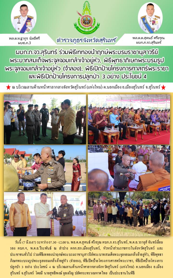 7 มิ.ย. 2567 16:37:29ผบก.ภ.จว.สุรินทร์ ร่วมพิธีเททองนำฤกษ์พระบรมราชานุสาวรีย์ พระบาทสมเด็จพระจุลจอมเกล้าเจ้าอยู่หัว, พิธีพุทธาภิเษกพระบรมรูปพระจุลจอมเกล้าเจ้าอยู่หัว (จำลอง), พิธีเปิดป้ายโครงการศาสตร์พระราชา และพิธีเปิดป้ายโครงการปลูกป่า 3 อย่าง ประโยชน์ 4 วันนี้ (7 มิ.ย.67) ระหว่าง 07.30 -12.00 น. พล.ต.ต.สุคนธ์ ศรี...