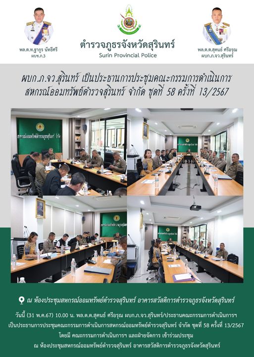 31 พ.ค. 2567 14:57:08ผบก.ภ.จว.สุรินทร์ เป็นประธานการประชุมคณะกรรมการดำเนินการ สหกรณ์ออมทรัพย์ตำรวจสุรินทร์ จำกัด ชุดที่ 58 ครั้งที่ 13/2567 วันนี้ (31 พ.ค.67) 10.00 น. พล.ต.ต.สุคนธ์ ศรีอรุณ ผบก.ภ.จว.สุรินทร์/ประธานคณะกรรมการดำเนินการฯ เป็นประธานการประชุมคณะกรรมการดำเนินการสหกรณ์ออมทรัพย์ตำรวจสุรินทร์ จำกัด ชุดที่ 58 ค...