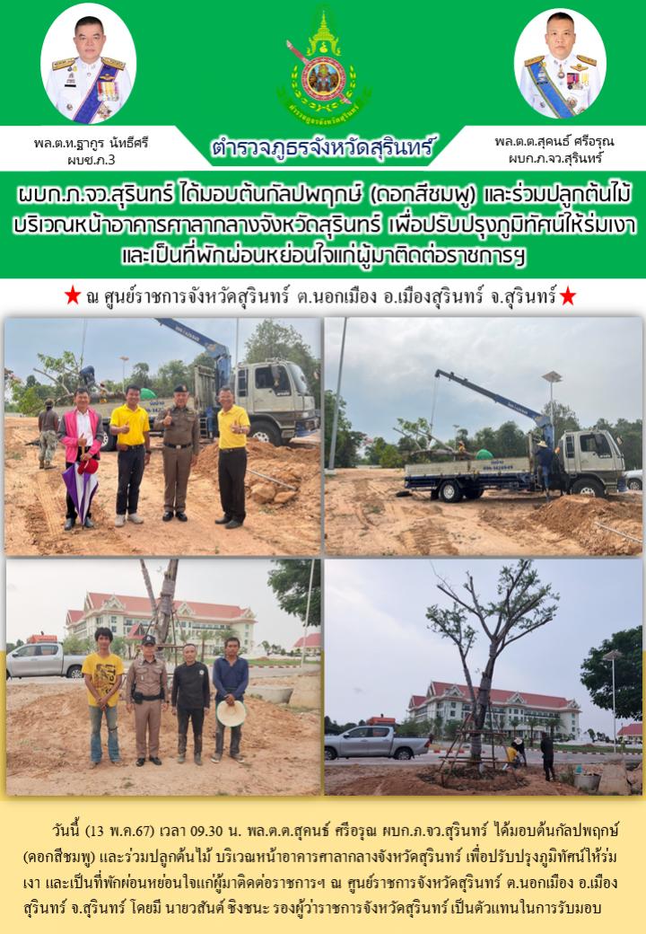 13 พ.ค. 2567 13:49:54ผบก.ภ.จว.สุรินทร์ ได้มอบต้นกัลปพฤกษ์ (ดอกสีชมพู) และร่วมปลูกต้นไม้ บริเวณหน้าอาคารศาลากลางจังหวัดสุรินทร์ เพื่อปรับปรุงภูมิทัศน์ให้ร่มเงา และเป็นที่พักผ่อนหย่อนใจแก่ผู้มาติดต่อราชการฯ วันนี้ (13 พ.ค.67) เวลา 09.30 น. พล.ต.ต.สุคนธ์ ศรีอรุณ ผบก.ภ.จว.สุรินทร์ ได้มอบต้นกัลปพฤกษ์ (ดอกสีชมพู) และร่วมปลูก...