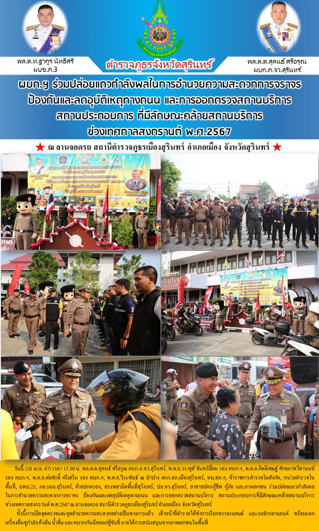 10 เม.ย. 2567 18:42:29ผบก.ฯ ร่วมปล่อยแถวกำลังพลในการอำนวยความสะดวกการจราจร ป้องกันและลดอุบัติเหตุทางถนน และการออกตรวจสถานบริการ สถานประกอบการ ที่มีลักษณะคล้ายสถานบริการ ช่วงเทศกาลสงกรานต์ พ.ศ.2567 วันนี้ (10 เม.ย. 67) เวลา 15.30 น. พล.ต.ต.สุคนธ์ ศรีอรุณ ผบก.ภ.จว.สุรินทร์, พ.ต.อ.วรายุส์ จันทร์เยี่ยม รอง ผบก.ฯ, พ.ต.อ.กิตต...