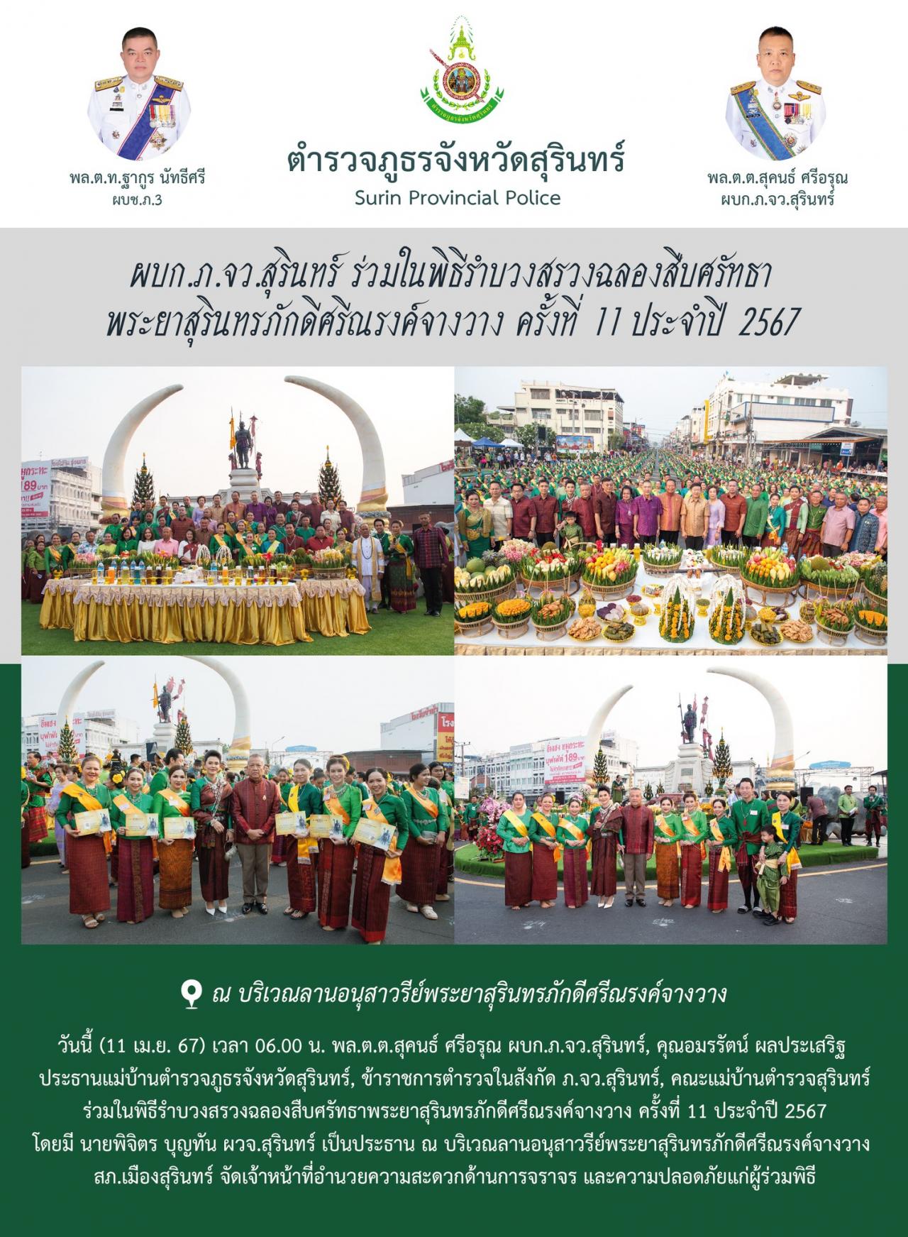 11 เม.ย. 2567 14:34:17ผบก.ภ.จว.สุรินทร์ ร่วมในพิธีรำบวงสรวงฉลองสืบศรัทธา พระยาสุรินทรภักดีศรีณรงค์จางวาง ครั้งที่ 11 ประจำปี 2567 วันนี้ (11 เม.ย. 67) เวลา 06.00 น. พล.ต.ต.สุคนธ์ ศรีอรุณ ผบก.ภ.จว.สุรินทร์, คุณอมรรัตน์ ผลประเสริฐ ประธานแม่บ้านตำรวจภูธรจังหวัดสุรินทร์, ข้าราชการตำรวจในสังกัด ภ.จว.สุรินทร์, คณะแม่บ้านตำรว...