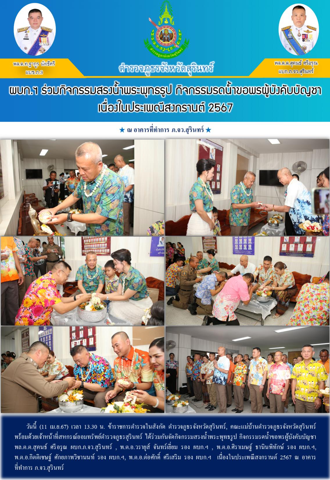 11 เม.ย. 2567 18:55:24ผบก.ฯ ร่วมกิจกรรมสรงน้ำพระพุทธรูป กิจกรรมรดน้ำขอพรผู้บังคับบัญชา เนื่องในประเพณีสงกรานต์ 2567 วันนี้ (11 เม.ย.67) เวลา 13.30 น. ข้าราชการตำรวจในสังกัด ตำรวจภูธรจังหวัดสุรินทร์, คณะแม่บ้านตำรวจภูธรจังหวัดสุรินทร์ พร้อมด้วยเจ้าหน้าที่สหกรณ์ออมทรัพย์ตำรวจภูธรสุรินทร์ ได้ร่วมกันจัดกิจกรรมสรงน้ำพระพุทธร...