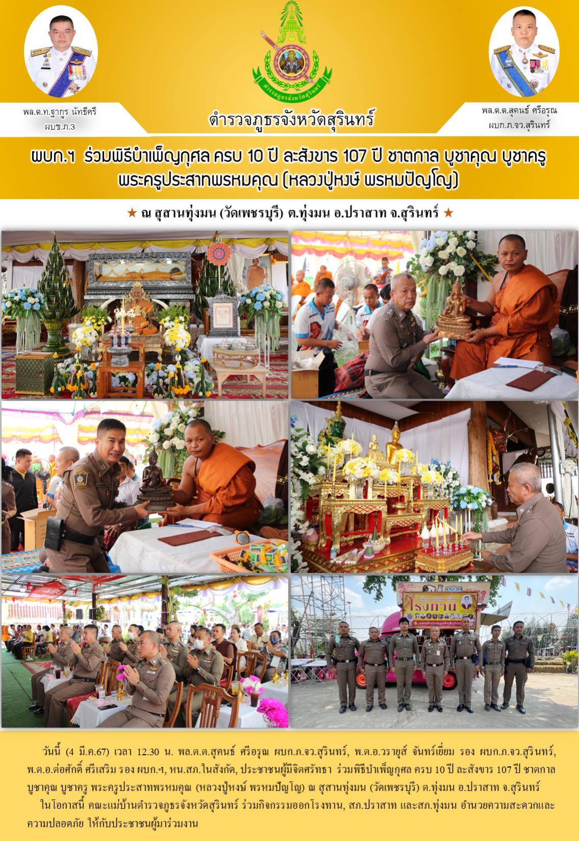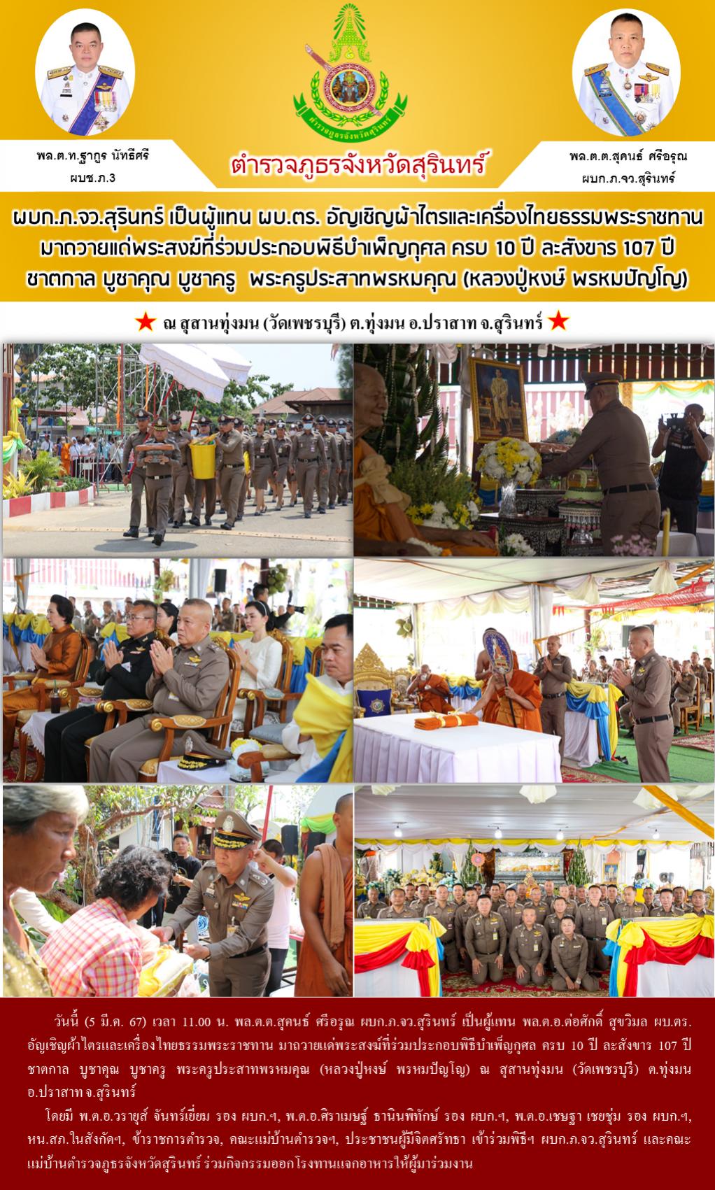 5 มี.ค. 2567 21:17:44ผบก.ภ.จว.สุรินทร์ เป็นผู้แทน ผบ.ตร. อัญเชิญผ้าไตรและเครื่องไทยธรรมพระราชทาน มาถวายแด่พระสงฆ์ที่ร่วมประกอบพิธีบำเพ็ญกุศล ครบ 10 ปี ละสังขาร 107 ปี ชาตกาล บูชาคุณ บูชาครู พระครูประสาทพรหมคุณ (หลวงปู่หงษ์ พรหมปัญโญ) วันนี้ (5 มี.ค. 67) เวลา 11.00 น. พล.ต.ต.สุคนธ์ ศรีอรุณ ผบก.ภ.จว.สุรินทร์ เป็นผู้แทน ...