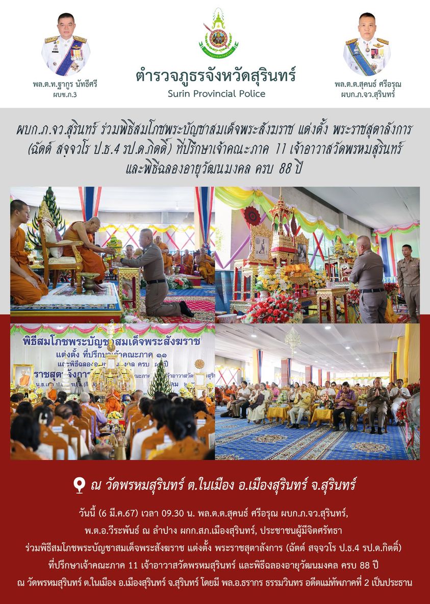 6 มี.ค. 2567 15:42:54ผบก.ภ.จว.สุรินทร์ ร่วมพิธีสมโภชพระบัญชาสมเด็จพระสังฆราช แต่งตั้ง พระราชสุตาลังการ (ฉัตต์ สจฺจวโร ป.ธ.4 รป.ด.กิตติ์) ที่ปรึกษาเจ้าคณะภาค 11 เจ้าอาวาสวัดพรหมสุรินทร์ และพิธีฉลองอายุวัฒนมงคล ครบ 88 ปี วันนี้ (6 มี.ค.67) เวลา 09.30 น. พล.ต.ต.สุคนธ์ ศรีอรุณ ผบก.ภ.จว.สุรินทร์, พ.ต.อ.วีระพันธ์ ณ ลำปาง ผก...
