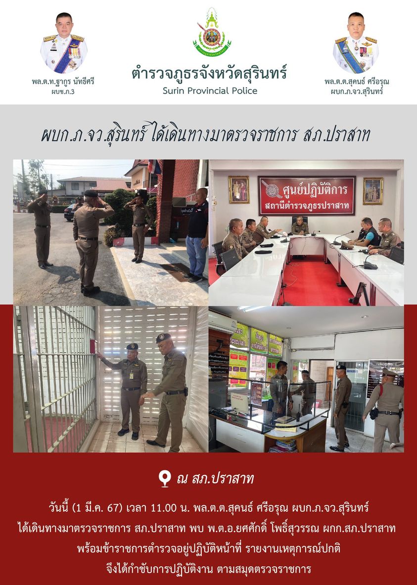 1 มี.ค. 2567 13:17:09ผบก.ภ.จว.สุรินทร์ ได้เดินทางมาตรวจราชการ สภ.ปราสาท วันนี้ (1 มี.ค. 67) เวลา 11.00 น. พล.ต.ต.สุคนธ์ ศรีอรุณ ผบก.ภ.จว.สุรินทร์ ได้เดินทางมาตรวจราชการ สภ.ปราสาท พบ พ.ต.อ.ยศศักดิ์ โพธิ์สุวรรณ ผกก.สภ.ปราสาท พร้อมข้าราชการตำรวจอยู่ปฏิบัติหน้าที่ รายงานเหตุการณ์ปกติ จึงได้กำชับการปฏิบัติงาน ตามสมุดตรวจรา...