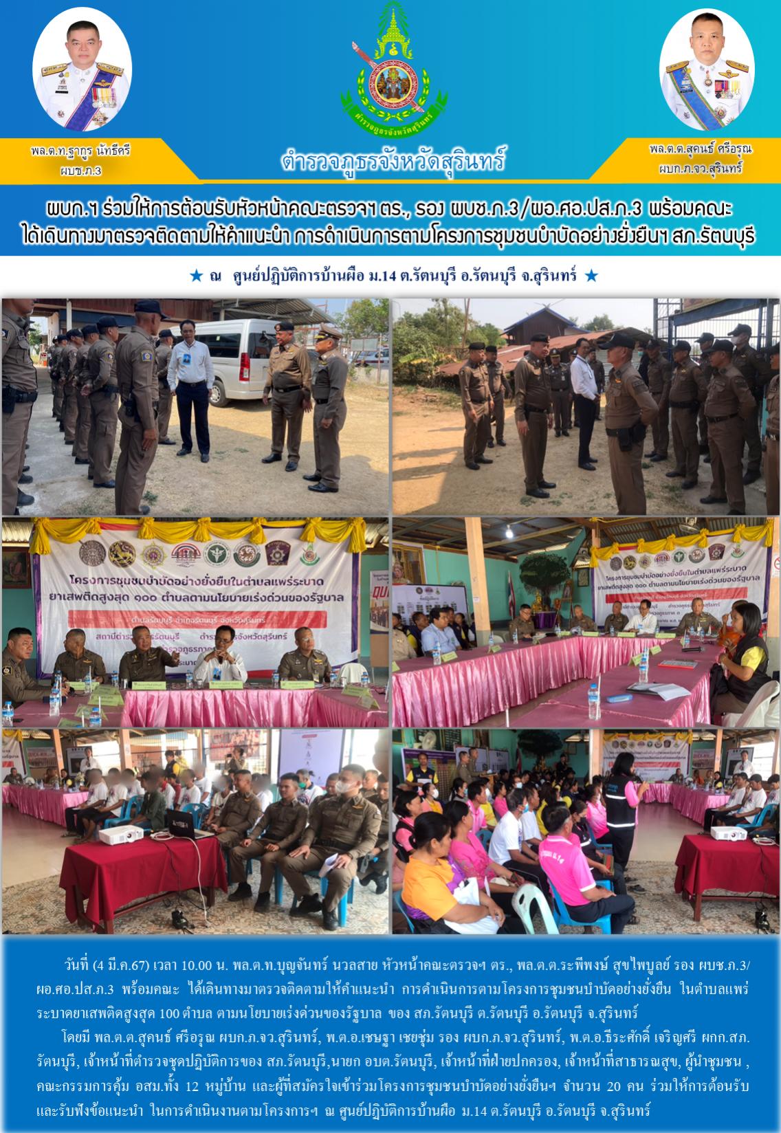 4 มี.ค. 2567 18:24:14ผบก.ฯ ร่วมให้การต้อนรับ หัวหน้าคณะตรวจฯ ตร., รอง ผบช.ภ.3/ผอ.ศอ.ปส.ภ.3 พร้อมคณะ ได้เดินทางมาตรวจติดตามให้คำแนะนำ การดำเนินการตามโครงการชุมชนบำบัดอย่างยั่งยืนฯ ของ สภ.รัตนบุรี วันที่ (4 มี.ค.67) เวลา 10.00 น. พล.ต.ท.บุญจันทร์ นวลสาย หัวหน้าคณะตรวจฯ ตร., พล.ต.ต.ระพีพงษ์ สุขไพบูลย์ รอง ผบช.ภ.3/ผอ.ศอ.ปส...