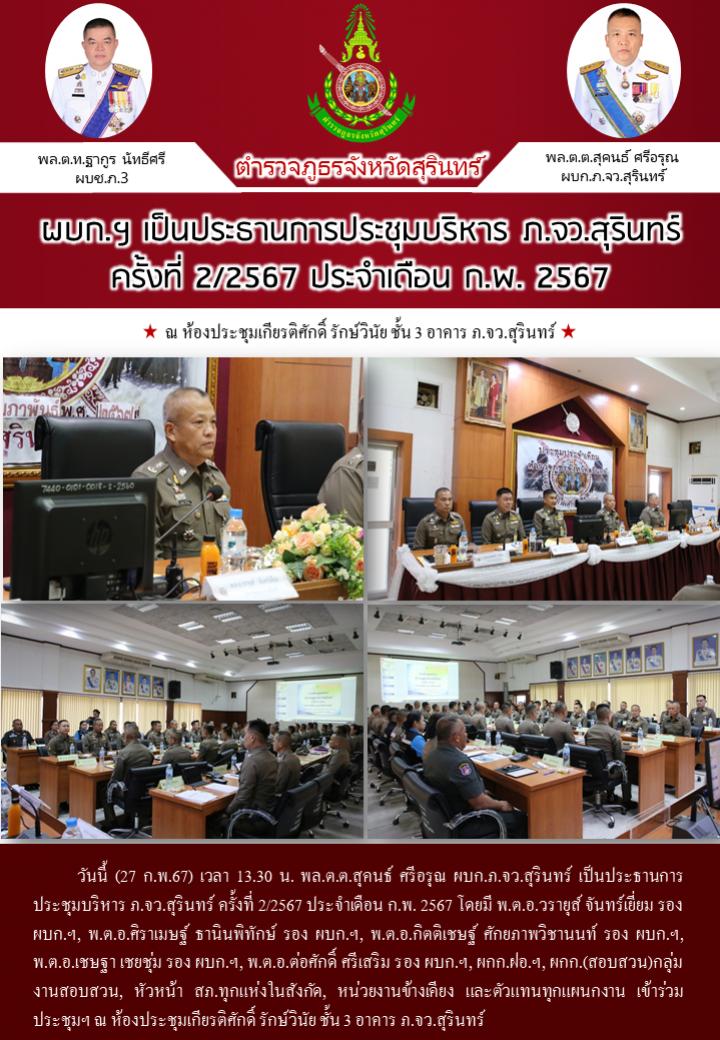 23 ก.พ. 2567 18:01:22 ผบก.ฯ ร่วมประชุมบริหาร ภ.3 ประจำเดือน ก.พ. 2567 วันนี้ (23 ก.พ.67) เวลา 13.30น. พล.ต.ต.สุคนธ์ ศรีอรุณ ผบก.ภ.จว.สุรินทร์, พ.ต.อ.ศิราเมษฐ์ ธานินพิทักษ์ รอง ผบก.ฯ, พ.ต.อ.กิตติเชษฐ์ ศักยภาพวิชานนท์, พ.ต.อ.เชษฐา เชยชุ่ม รอง ผบก.ฯ, พ.ต.อ.ต่อศักดิ์ ศรีเสริม รอง ผบก.ฯ พร้อมด้วย ผกก.ฝอ.ภ.จว.สุรินทร์, ผ...