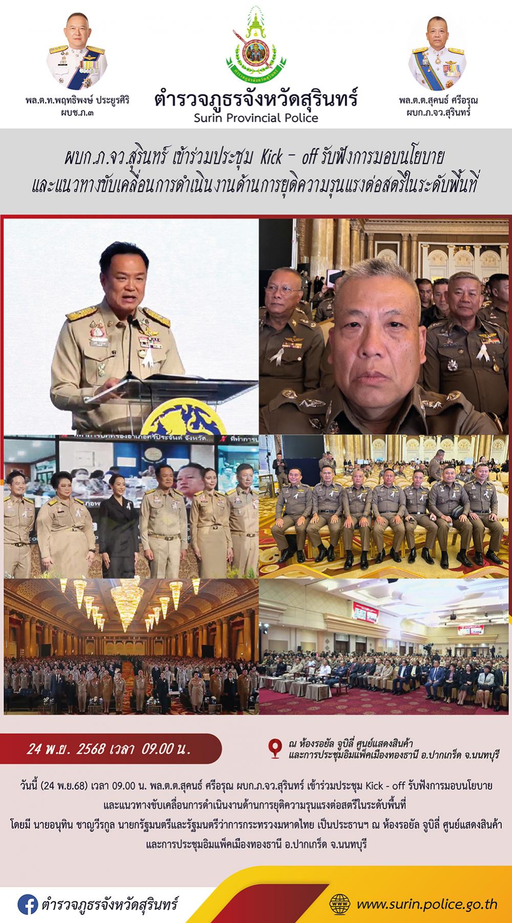 24 พ.ย. 2568 13:09:57ผบก.ภ.จว.สุรินทร์ เข้าร่วมประชุม Kick - off รับฟังการมอบนโยบาย และแนวทางขับเคลื่อนการดำเนินงานด้านการยุติความรุนแรงต่อสตรีในระดับพื้นที่ วันนี้ (24 พ.ย.68) เวลา 09.00 น. พล.ต.ต.สุคนธ์ ศรีอรุณ ผบก.ภ.จว.สุรินทร์ เข้าร่วมประชุม Kick - off รับฟังการมอบนโยบาย และแนวทางขับเคลื่อนการดำเนินงานด้านการยุติ...