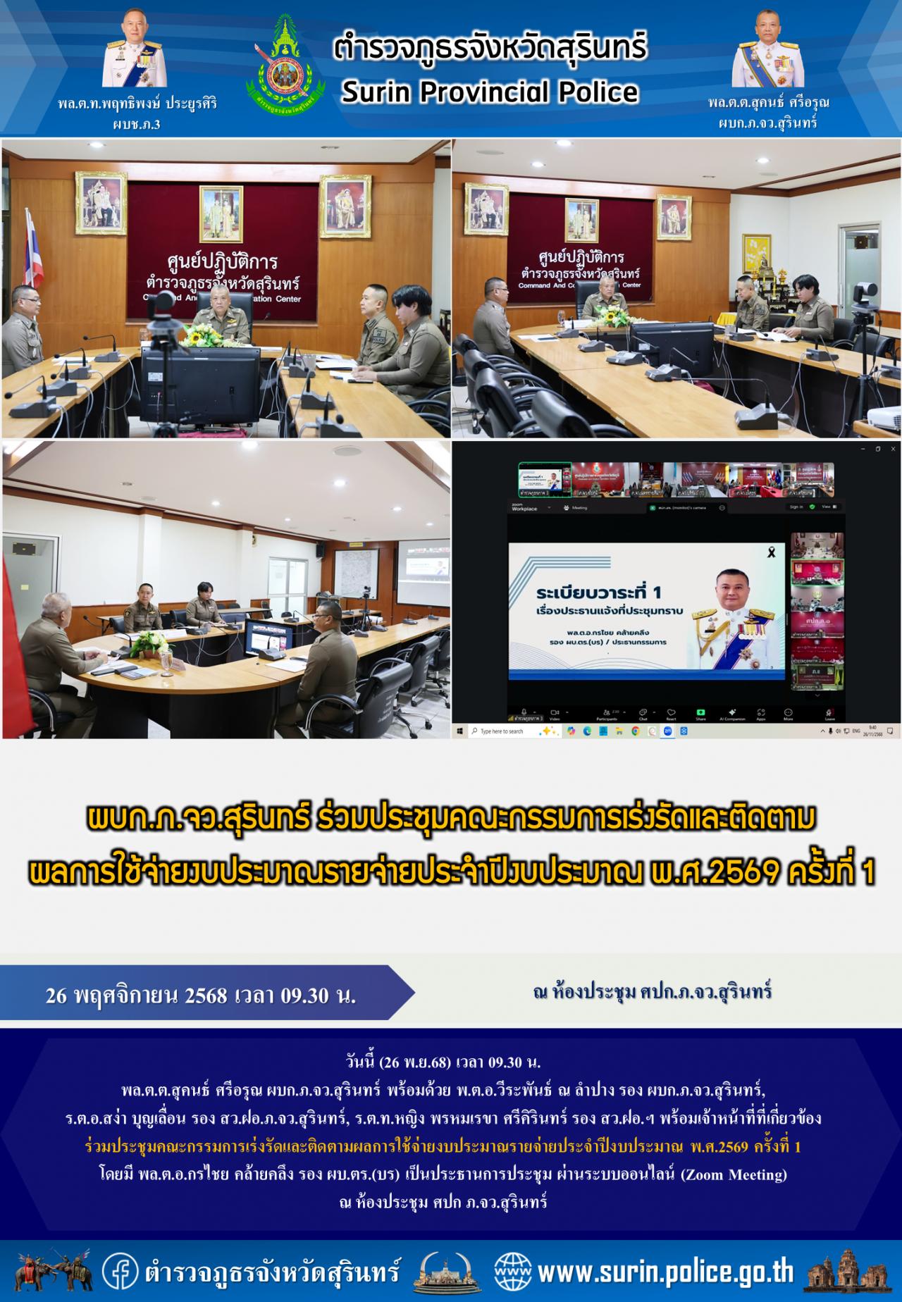 26 พ.ย. 2568 10:53:25ผบก.ภ.จว.สุรินทร์ ร่วมประชุมคณะกรรมการเร่งรัดและติดตาม ผลการใช้จ่ายงบประมาณรายจ่ายประจำปีงบประมาณ พ.ศ.2569 ครั้งที่ 1 วันนี้ (26 พ.ย.68) เวลา 09.30 น. พล.ต.ต.สุคนธ์ ศรีอรุณ ผบก.ภ.จว.สุรินทร์ พร้อมด้วย พ.ต.อ.วีระพันธ์ ณ ลำปาง รอง ผบก.ภ.จว.สุรินทร์, ร.ต.อ.สง่า บุญเลื่อน รอง สว.ฝอ.ภ.จว.สุรินทร์, ร....