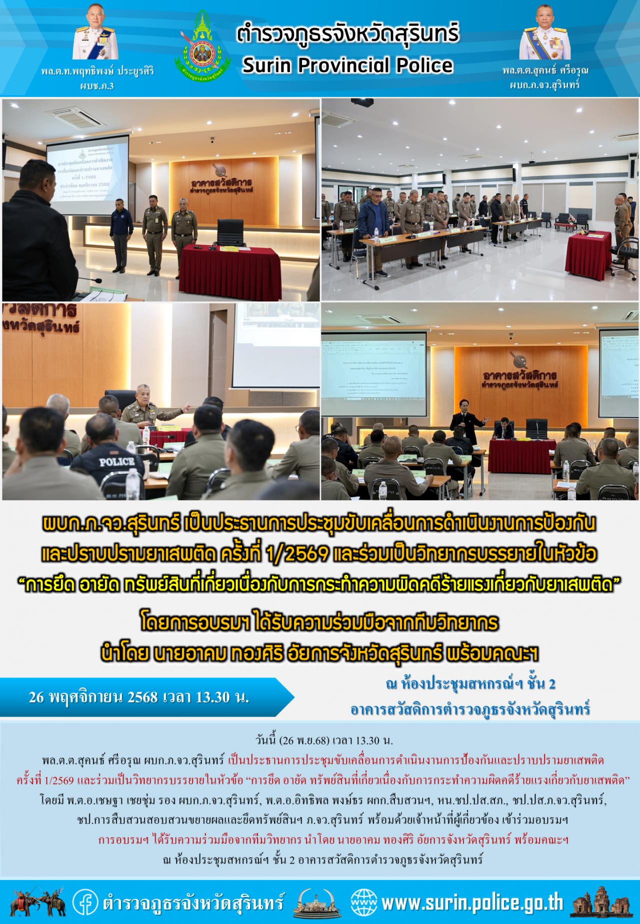 26 พ.ย. 2568 18:43:40ผบก.ภ.จว.สุรินทร์ เป็นประธานการประชุมขับเคลื่อนการดำเนินงานการป้องกันและปราบปรามยาเสพติด ครั้งที่ 1/2569 และร่วมเป็นวิทยากรบรรยายในหัวข้อ “การยึด อายัด ทรัพย์สินที่เกี่ยวเนื่องกับการกระทำความผิดคดีร้ายแรงเกี่ยวกับยาเสพติด” โดยการอบรมฯ ได้รับความร่วมมือจากทีมวิทยากร นำโดย นายอาคม ทองศิริ อัยการจังหว...
