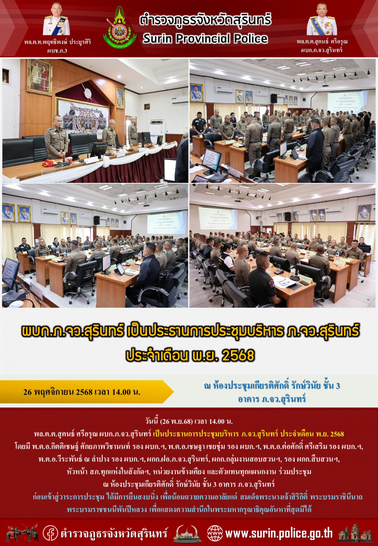 26 พ.ย. 2568 18:43:50ผบก.ภ.จว.สุรินทร์ เป็นประธานการประชุมบริหาร ภ.จว.สุรินทร์ ประจำเดือน พ.ย. 2568 วันนี้ (26 พ.ย.68) เวลา 14.00 น. พล.ต.ต.สุคนธ์ ศรีอรุณ ผบก.ภ.จว.สุรินทร์ เป็นประธานการประชุมบริหาร ภ.จว.สุรินทร์ ประจำเดือน พ.ย. 2568 โดยมี พ.ต.อ.กิตติเชษฐ์ ศักยภาพวิชานนท์ รอง ผบก.ฯ, พ.ต.อ.เชษฐา เชยชุ่ม รอง ผบก.ฯ, พ.ต...