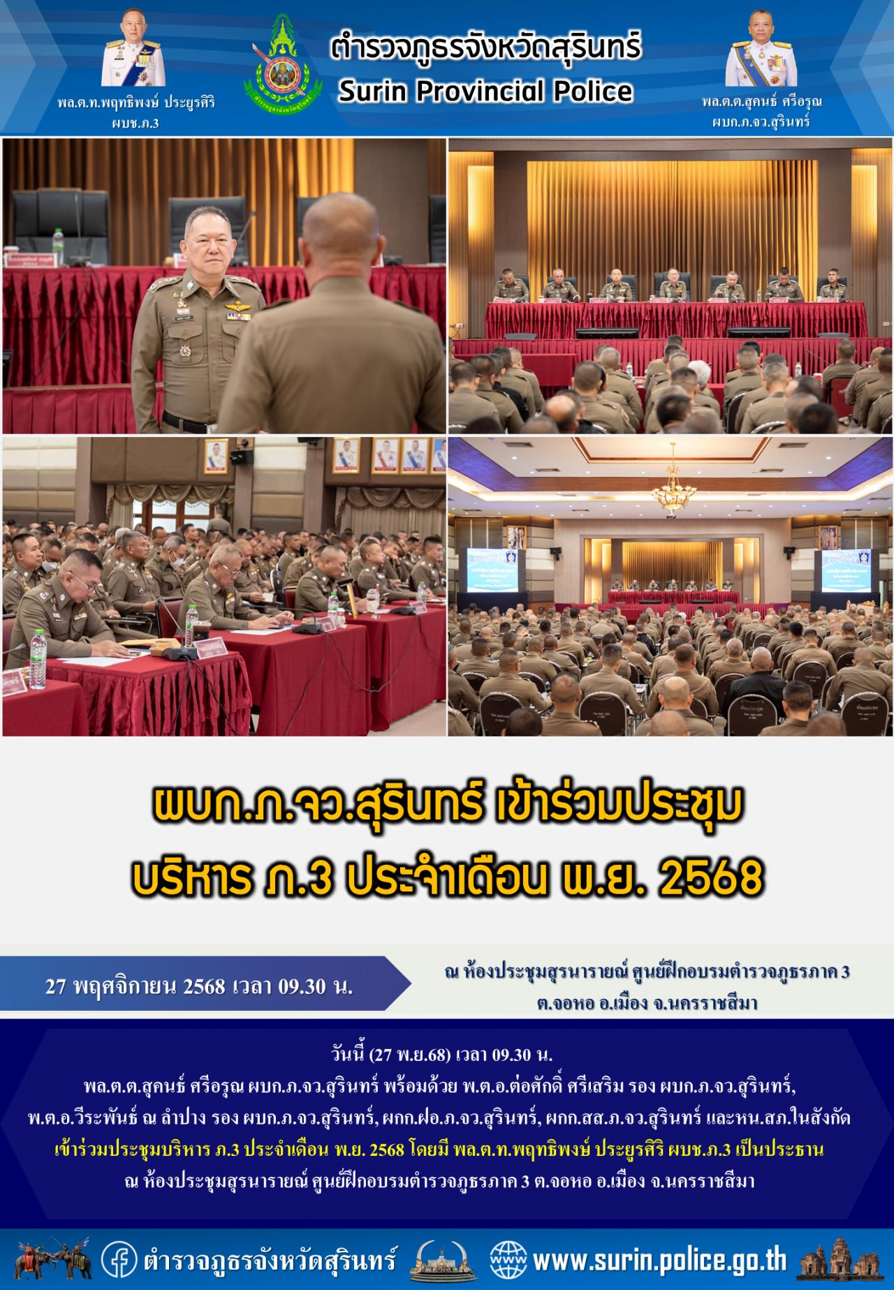 27 พ.ย. 2568 13:53:01ผบก.ภ.จว.สุรินทร์ เข้าร่วมประชุม บริหาร ภ.3 ประจำเดือน พ.ย. 2568 วันนี้ (27 พ.ย.68) เวลา 09.30 น. พล.ต.ต.สุคนธ์ ศรีอรุณ ผบก.ภ.จว.สุรินทร์ พร้อมด้วย พ.ต.อ.ต่อศักดิ์ ศรีเสริม รอง ผบก.ภ.จว.สุรินทร์, พ.ต.อ.วีระพันธ์ ณ ลำปาง รอง ผบก.ภ.จว.สุรินทร์, ผกก.ฝอ.ภ.จว.สุรินทร์, ผกก.สส.ภ.จว.สุรินทร์ และหน.สภ....