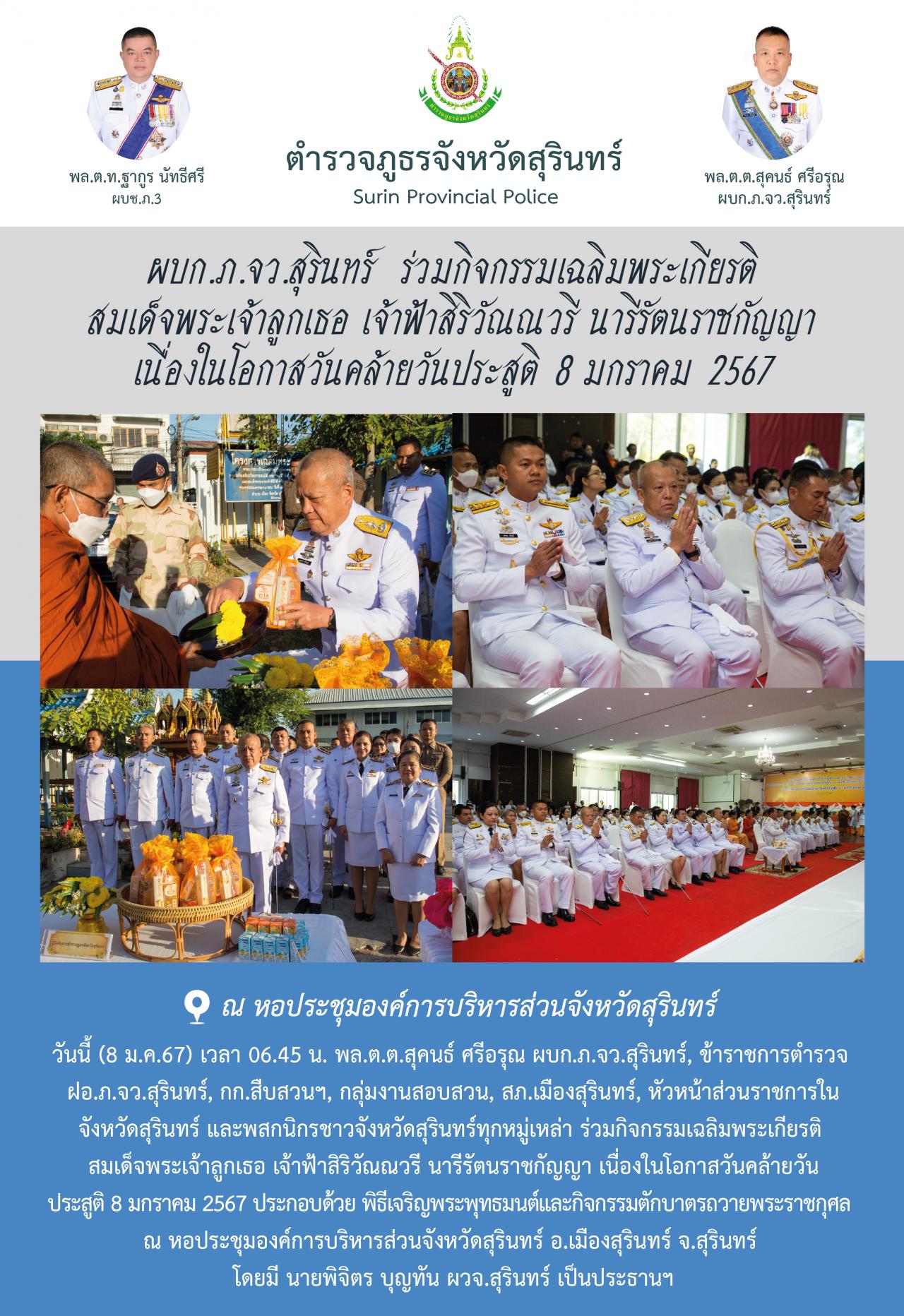 8 ม.ค. 2567 09:19:25ผบก.ภ.จว.สุรินทร์ ร่วมกิจกรรมเฉลิมพระเกียรติ สมเด็จพระเจ้าลูกเธอ เจ้าฟ้าสิริวัณณวรี นารีรัตนราชกัญญา เนื่องในโอกาสวันคล้ายวันประสูติ 8 มกราคม 2567 วันนี้ (8 ม.ค.67) เวลา 06.45 น. พล.ต.ต.สุคนธ์ ศรีอรุณ ผบก.ภ.จว.สุรินทร์, ข้าราชการตำรวจ ฝอ.ภ.จว.สุรินทร์, กก.สืบสวนฯ, กลุ่มงานสอบสวน, สภ.เมืองสุรินทร์...