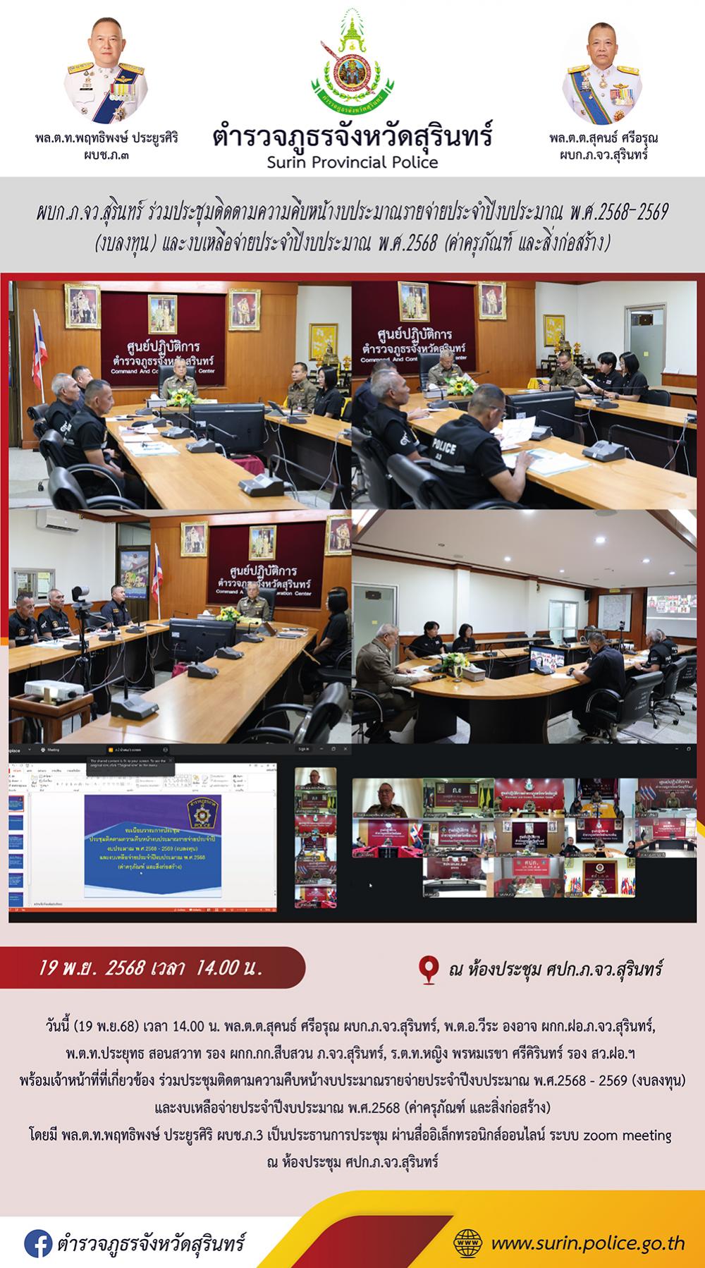19 พ.ย. 2568 15:33:07ผบก.ภ.จว.สุรินทร์ ร่วมประชุมติดตามความคืบหน้างบประมาณรายจ่ายประจำปีงบประมาณ พ.ศ.2568-2569 (งบลงทุน) และงบเหลือจ่ายประจำปีงบประมาณ พ.ศ.2568 (ค่าครุภัณฑ์ และสิ่งก่อสร้าง) วันนี้ (19 พ.ย.68) เวลา 14.00 น. พล.ต.ต.สุคนธ์ ศรีอรุณ ผบก.ภ.จว.สุรินทร์, พ.ต.อ.วีระ องอาจ ผกก.ฝอ.ภ.จว.สุรินทร์, พ.ต.ท.ประยุทธ สอ...