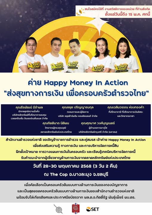 2 พ.ค. 2568 10:42:56“Happy Money In Action” ส่งสุขทางการเงิน เพื่อครอบครัวตำรวจไทย เงินดี ชีวิตดี ครอบครัวมีความสุข สำนักงานตำรวจแห่งชาติ ร่วมกับ สมาคมแม่บ้านตำรวจ และ ตลาดหลักทรัพย์แห่งประเทศไทย ขอเชิญข้าราชการตำรวจและคู่สมรสเข้าร่วม โครงการ Money Management & Investment ประจำปี 2568 ค่ายอบรม 3 วัน 2 คืน วันที่ 28 – 3...