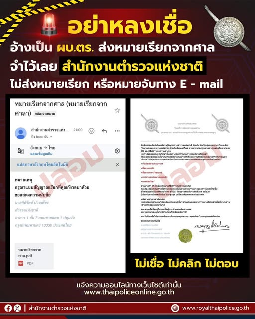 6 พ.ค. 2568 10:41:58🚨อย่าหลงเชื่อ⚠️ อ้างเป็น ผบ.ตร. ส่งหมายเรียกจากศาล จำไว้เลย ‼️ สำนักงานตำรวจแห่งชาติ ไม่ส่งหมายเรียก หรือหมายจับ ทาง E - mail 📍ไม่เชื่อ 📍ไม่คลิก 📍ไม่ตอบ แจ้งความออนไลน์ ทางเว็บไซต์เท่านั้น www.thaipoliceonline.com #เตือนภัยออนไลน์ #สำนักงานตำรวจแห่งชาติ #Royalthaipolice...
