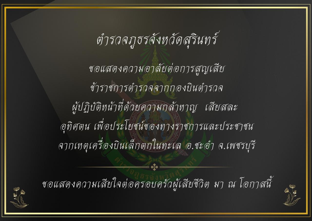 25 เม.ย. 2568 15:32:24ตำรวจภูธรจังหวัดสุรินทร์ ขอแสดงความอาลัยต่อการสูญเสีย ข้าราชการตำรวจจากกองบินตำรวจ ผู้ปฏิบัติหน้าที่ด้วยความกล้าหาญ เสียสละ อุทิศตน เพื่อประโยชน์ของทางราชการและประชาชน จากเหตุเครื่องบินเล็กตกในทะเล อ.ชะอำ จ.เพชรบุรี ขอแสดงความเสียใจต่อครอบครัวผู้เสียชีวิต มา ณ โอกาสนี้ ...