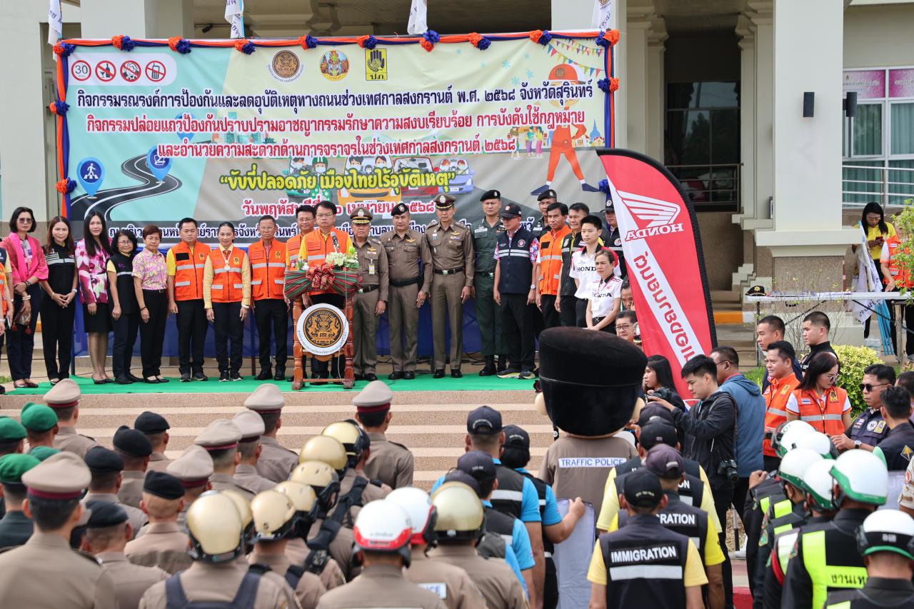 10 เม.ย. 2568 21:28:17ภ.จว.สุรินทร์ ร่วมกิจกรรมรณรงค์การป้องกันและลดอุบัติเหตุทางถนนช่วงเทศกาลสงกรานต์ พ.ศ. 2568 จังหวัดสุรินทร์, กิจกรรมปล่อยแถวป้องกันปราบปรามอาชญากรรมรักษาความสงบเรียบร้อย การบังคับใช้กฎหมาย และอำนวยความสะดวกด้านการจราจร โดยร่วมกับศูนย์อำนวยการความปลอดภัยทางถนนจังหวัดสุรินทร์ ปล่อยขบวนรณรงค์ป้องกันและล...