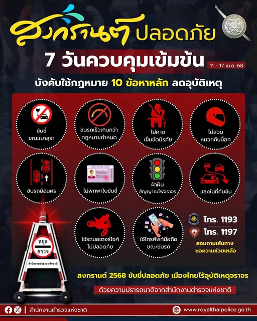 11 เม.ย. 2568 17:19:18🚨เริ่มแล้ว 7 วัน ควบคุมเข้มข้น‼️ ขับขี่ปลอดภัย เมืองไทยไร้อุบัติเหตุจราจร ✨ ตำรวจบังคับใช้กฎหมาย 10 ข้อหาหลัก เพื่อลดความเสี่ยงปัจจัยของอุบัติเหตุที่ทำให้เกิดการสูญเสียในช่วงเทศกาลสงกรานต์ 2568 . 📍กำหนด 5 ข้อเน้นหนัก บังคับใช้กฎหมายกวดขันวินัยจราจรเพื่อความปลอดภัย ❌ เมาแล้วขับ ❌ ขับรถเร็วเกินกว่...