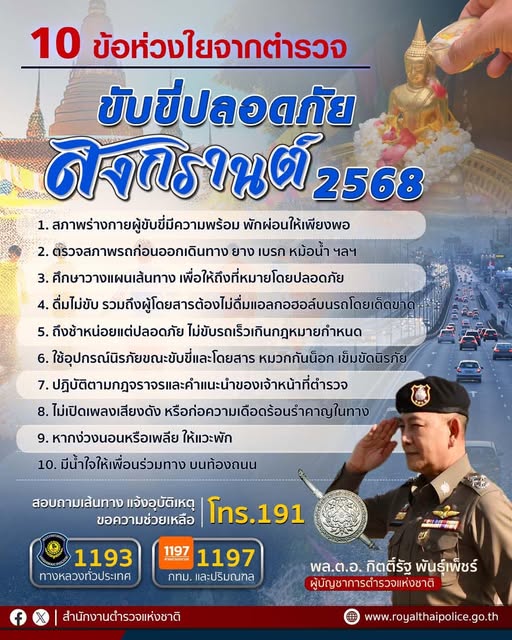 11 เม.ย. 2568 17:19:42🚨 10 ข้อห่วงใยจาก ( ใจ ) ตำรวจ สงกรานต์ 2568 ขับขี่ปลอดภัยเดินทางถึงที่หมายไปหาคนที่ท่านรัก 🩷 . 1. สภาพร่างกายผู้ขับขี่มีความพร้อม พักผ่อนให้เพียงพอ 2. ตรวจสภาพรถก่อนออกเดินทาง ยาง เบรก หม้อน้ำ ฯลฯ 3. ศึกษาวางแผนเส้นทาง เพื่อให้ถึงที่หมายโดยปลอดภัย 4. ดื่มไม่ขับ รวมถึงผู้โดยสารต้องไม่ดื่มแอลกอฮอล์บน...
