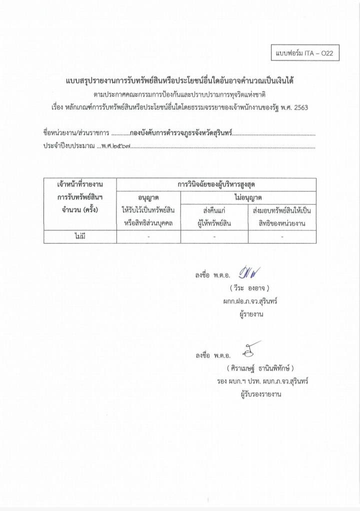 25 ก.พ. 2568 14:38:43แบบสรุปรายงานการรับทรัพย์สินหรือประโยชน์อื่นใดอันอาจคำนวณเป็นเงินได้ ตามประกาศคณะกรรมการป้องกันและปราบปรามการทุจริตแห่งชาติ เรื่อง หลักเกณฑ์การรับทรัพย์สินหรือประโยชน์อื่นใดโดยธรรมจรรยาของเจ้าพนักงานของรัฐ พ.ศ.2563 กองบังคับการตำรวจภูธรจังหวัดสุรินทร์ ประจำปีงบประมาณ พ.ศ.2567...