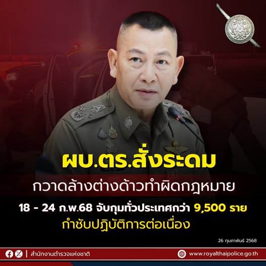 26 ก.พ. 2568 18:01:24ผบ.ตร. สั่งระดมกวาดล้างต่างด้าวกระทำผิดกฎหมายทั่วประเทศ 18 – 24 กุมภาพันธ์ 2568 จับกุมกว่า 9,500 ราย กำชับปฏิบัติการต่อเนื่อง . เมื่อวันที่ 26 กุมภาพันธ์ 2568 พล.ต.ท.อาชยน ไกรทอง โฆษกสำนักงานตำรวจแห่งชาติ เปิดเผยว่า ตามนโยบาย พล.ต.อ.กิตติ์รัฐ พันธุ์เพ็ชร์ ผู้บัญชาการตำรวจแห่งชาติ (ผบ.ตร.) สั่งการให้...