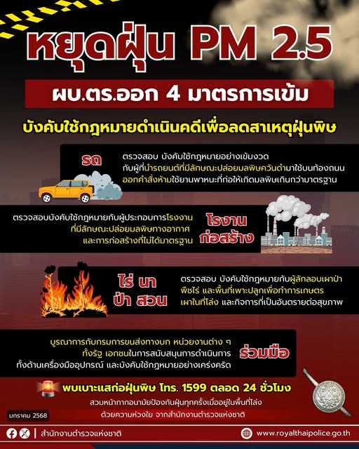 29 ม.ค. 2568 09:24:28🚨หยุดฝุ่น PM 2.5 ⛔️💨 ผบ.ตร. ออก 4 มาตรการบังคับใช้กฎหมาย ดำเนินคดีเข้ม เพื่อลดสาเหตุการเกิดฝุ่นละออง PM 2.5 . พล.ต.อ.กิตติ์รัฐ พันธุ์เพ็ชร์ ผบ.ตร. สั่งการตำรวจทุกหน่วยเพิ่มมาตรการเข้ม ตรวจสอบ และ บังคับใช้กฎหมายเพื่อลดสาเหตุการก่อฝุ่นละลองขนาดเล็ก PM 2.5 ซึ่งเป็นอันตรายต่อสุขภาพประชาชน . 🚕💨 รถ - ตรว...