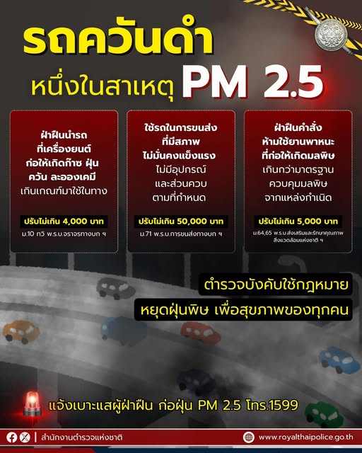 29 ม.ค. 2568 09:25:03⛔️ หยุดรถควันดำ 🚗💨 ⛔️ หยุด ฝุ่นPM2.5 . รถควันดำ หนึ่งในสาเหตุเพิ่มฝุ่นละอองขนาดเล็ก PM 2.5 . ตำรวจบังคับใช้กฎหมาย #รถควันดำ เพื่อสุขภาพของทุก 🚨 ฝ่าฝืนนำรถรถที่เครื่องยนต์ก่อให้เกิดก๊าซ ฝุ่น ควัน ละอองเคมี เกินเกณฑ์มาใช้ในทาง - ปรับไม่เกิน 4,000 บาท ( พ.ร.บ.จราจรทางบกฯ ) 🚨 ใช้รถในการขนส่งที่มีสภา...