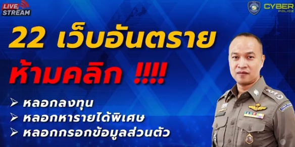 29 ม.ค. 2568 09:29:45ตำรวจไซเบอร์ เตือน 22 เว็บอันตราย ห้ามคลิก!!! . พล.ต.ท.ไตรรงค์ ผิวพรรณ ผู้บัญชาการตำรวจสืบสวนสอบสวนอาชญากรรมทางเทคโนโลยี เตือนพี่น้องประชาชน 22 เว็บมิจฉาชีพที่ห้ามกด โดยกล่าวว่า มิจฉาชีพมักจะสร้างเว็บปลอมที่เกี่ยวกับ การลงทุน, หลอกหารายได้พิเศษ, หลอกใส่ข้อมูลส่วนตัว โดยเมื่อมีเหยื่อหลงเชื่อก็จะหลอกใ...