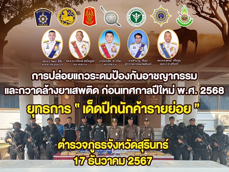 17 ธ.ค. 2567 11:21:02ปล่อยแถวระดมป้องกันอาชญากรรมและกวาดล้างยาเสพติด ก่อนเทศกาลปีใหม่ พ.ศ. 2568 ยุทธการ "ปฏิบัติการเมืองช้าง กวาดล้างยาเสพติด“ พ.ต.อ.เชษฐา เชยชุ่ม รอง ผบก.ภ.จว.สุรินทร์ พร้อมด้วย พ.ต.อ.อิทธิพล พงษ์ธร ผกก สืบสวน ภ.จว.สุรินทร์ ,พ.ต.อ.วีรพันธ์ ณ ลำปาง ผกก.สภ.เมืองสุรินทร์ , หน.ส่วนราชการ เเละชุดปฏิบัติกา...