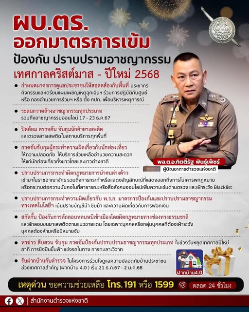 24 ธ.ค. 2567 10:49:33👮♂️ "พิทักษ์ 1" ออกมาตรการเข้มดูแลชีวิตและทรัพย์สินของพี่น้องประชาชน ช่วงเทศกาลปีใหม่ 🚨 . พล.ต.อ.กิตติ์รัฐ พันธุ์เพ็ชร์ ผู้บัญชาการตำรวจแห่งชาติ สั่งการตำรวจทั่วประเทศ กำชับป้องกัน ปราบปรามอาชญากรรม เทศกาลคริสต์มาส - ปีใหม่ 2568 🎉 . 📍กำหนดมาตรการดูแลประชาชนให้สอดคล้องกับพื้นที่ ประชากร กิจกรรม และเ...