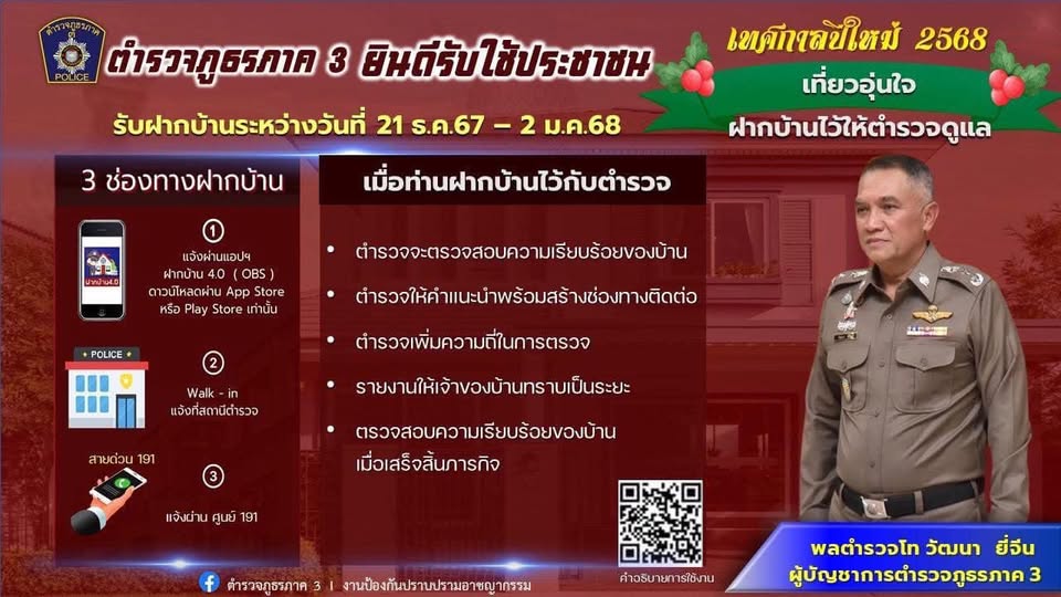 24 ธ.ค. 2567 10:47:28📣 เริ่มแล้ว #ฝากบ้านกับตำรวจ 🚨🏡 ปีใหม่นี้หยุดยาว ฝากบ้านไว้ให้ตำรวจช่วยดูแล . 2 ช่องทางฝากบ้านกับตำรวจ 👮♂️ 1.แจ้งฝากแอปพลิเคชัน ฝากบ้าน 4.0 ( OBS ) โหลดผ่าน App Store หรือ Google play Store เท่านั้น 2.วอล์กอิน ไปแจ้งที่สถานีตำรวจในพื้นที่บ้านของท่าน . สำนักงานตำรวจแห่งชาติแนะนำ 👮♂️ เช็กลิสต์ 10 ส...