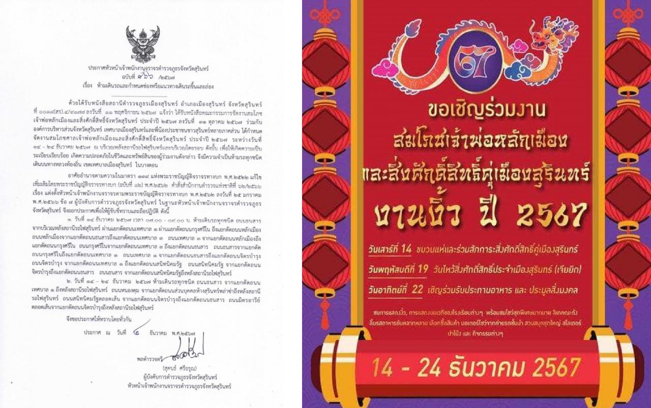 4 ธ.ค. 2567 15:55:05งานสมโภชเจ้าพ่อหลักเมืองและสิ่งศักดิ์สิทธิ์คู่เมืองสุรินทร์(งานงิ้วสุรินทร์) ตั้งแต่วันที่ 14 - 24 ธันวาคม 2567 🚨แจ้งปิดเส้นทางการจราจร ผู้ใช้รถใช้ถนนควรวางแผนการเดินทาง🚨 - วันที่ 14 ธันวาคม 2567 เวลา 07.00 – 09.00 น. ห้ามเดินรถทุกชนิดบริเวณหลังสถานีรถไฟสุรินทร์ ผ่านแยกตัดถนนเทศบาล 1 ผ่านแยกตัดถ...