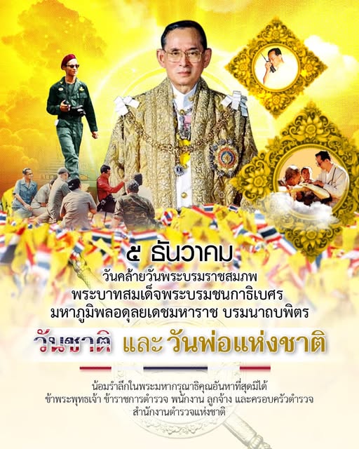 5 ธ.ค. 2567 14:07:08💛 ๕ ธันวาคม วันคล้ายวันพระบรมราชสมภพ พระบาทสมเด็จพระบรมชนกาธิเบศร มหาภูมิพลอดุลยเดชมหาราช บรมนาถบพิตร วันชาติ และวันพ่อแห่งชาติ 🇹🇭 น้อมรำลึกในพระมหากรุณาธิคุณอันหาที่สุดมิได้ ข้าพระพุทธเจ้า ข้าราชการตำรวจ พนักงาน ลูกจ้าง และครอบครัวตำรวจ สำนักงานตำรวจแห่งชาติ #น้อมรําลึกในพระมหากรุณาธิคุณ #วันพ่อ...