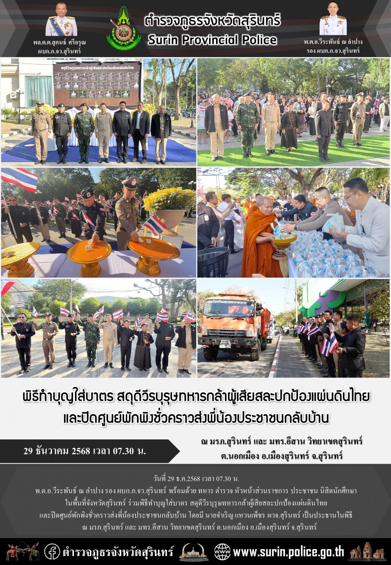 29 ธ.ค. 2568 14:27:38พิธีทำบุญใส่บาตร สดุดีวีรบุรุษทหารกล้าผู้เสียสละปกป้องแผ่นดินไทยและปิดศูนย์พักพิงชั่วคราวส่งพี่น้องประชาชนกลับบ้าน วันที่ 29 ธ.ค.2568 เวลา 07.30 น. พ.ต.อ.วีระพันธ์ ณ ลำปาง รอง ผบก.ภ.จว.สุรินทร์ พร้อมด้วย ทหาร ตำรวจ หัวหน้าส่วนราชการ ประชาชน นิสิตนักศึกษา ในพื้นที่จังหวัดสุรินทร์ ร่วมพิธีทำบุญใส่บ...