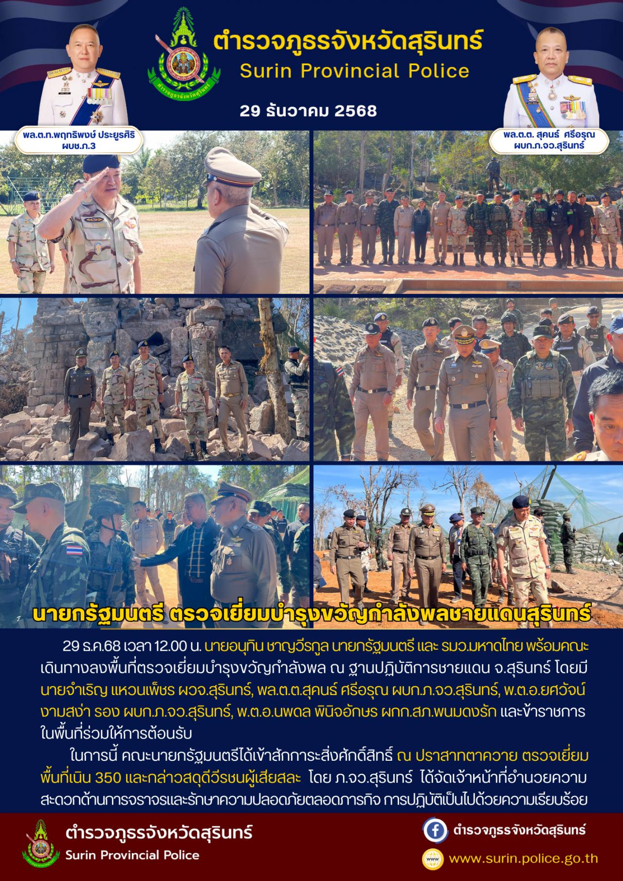 29 ธ.ค. 2568 18:50:40วันนี้ (29 ธ.ค. 68) เวลา 12.00 น. นายอนุทิน ชาญวีรกูล นายกรัฐมนตรี และรมว.มหาดไทย พร้อมด้วย พล.ท.อดุลย์ บุญธรรมเจริญ รมช.กลาโหม พร้อมคณะ เดินทางลงพื้นที่จังหวัดสุรินทร์ เพื่อตรวจเยี่ยมและให้กำลังใจกำลังพลที่ปฏิบัติหน้าที่ป้องกันชายแดน โดยมี นายจำเริญ แหวนเพ็ชร ผู้ว่าราชการจังหวัดสุรินทร์, พล.ต.ต.สุค...