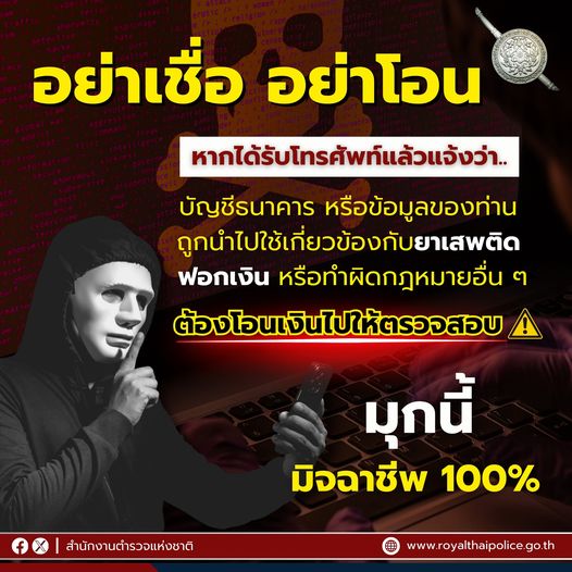 9 ก.ค. 2567 17:33:35เอะใจสักนิด ⁉️ 🚨อย่าเชื่อ อย่าโอน 🚨 หากท่านได้รับโทรศัพท์อ้างตัวเป็นเจ้าหน้าที่หน่วยงานราชการ หรือธนาคารแจ้งว่าเงินในบัญชี หรือข้อมูลส่วนตัวของท่านมีปัญหา ถูกนำไปใช้เกี่ยวข้องกับยาเสพติด ฟอกเงิน หรือทำผิดกฎหมายอื่น ๆ ต้องโอนเงินไปให้ตรวจสอบ เพื่อแสดงความบริสุทธิ์⚠️ มามุกนี้ มิจฉาชีพชัวร์ 100% ไม่เช...