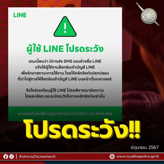 18 มิ.ย. 2567 10:33:56🚨คำเตือนจาก LINE Thailand หากได้รับข้อความลักษณะ เช่นนี้ อย่าเชื่อ อย่าหลงกล⚠️ “ผู้ใช้ LINE โปรดระวัง ขณะนี้พบว่า มีการส่ง SMS แอบอ้างชื่อ LINE แจ้งให้ผู้ใช้งานล็อกอินเข้าบัญชี LINE เพื่อรักษาสถานะการใช้งาน โดยให้คลิกลิงก์แปลกปลอม ที่นำไปสู่การให้ล็อกอินเข้าบัญชี LINE บนหน้าเว็บเบราเซอร์ จึงใคร่ขอเ...