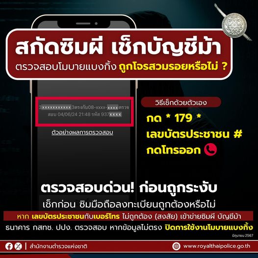 5 มิ.ย. 2567 14:21:23เช็กกันหรือยัง ‼️ มาตรการสกัดซิมผี แก้บัญชีม้า รีบเช็กเลย *179*เลขบัตรประชาชน# โทรออก ซิมลงทะเบียนถูกต้องหรือไม่ หากชื่อซิมไม่ตรงกับ Mobile Banking ถูกระงับบัญชี . สำนักงานคณะกรรมการกิจการกระจายเสียงกิจการโทรทัศน์และกิจการโทรคมนาคม ( กสทช.) ร่วมกับ ปปง. ธนาคาร และ ผู้ประกอบการโทรศัพท์เคลื่อนที่ ได้ร...