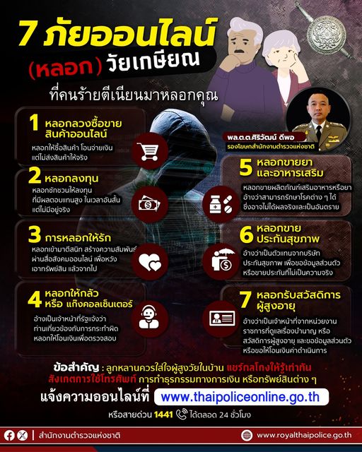 12 มิ.ย. 2567 09:04:39📢🚨เตือน 7 ภัยออนไลน์วัยเกษียณ ที่คนร้ายตีเนียนมาหลอกลวง ⚠️ . พล.ต.ต.ศิริวัฒน์ ดีพอ รองโฆษกสำนักงานตำรวจแห่งชาติ เปิดเผยว่าพล.ต.อ.กิตติ์รัฐ พันธุ์เพ็ชร์ รอง ผบ.ตร. รักษาราชการแทน ผบ.ตร. ห่วงใยพี่น้องประชาชนที่อาจได้รับความเสียหายจากอาชญากรรมรูปแบบต่าง ๆ ซึ่งในปัจจุบัน สำนักงานตำรวจแห่งชาติพบว่ามีกลุ...