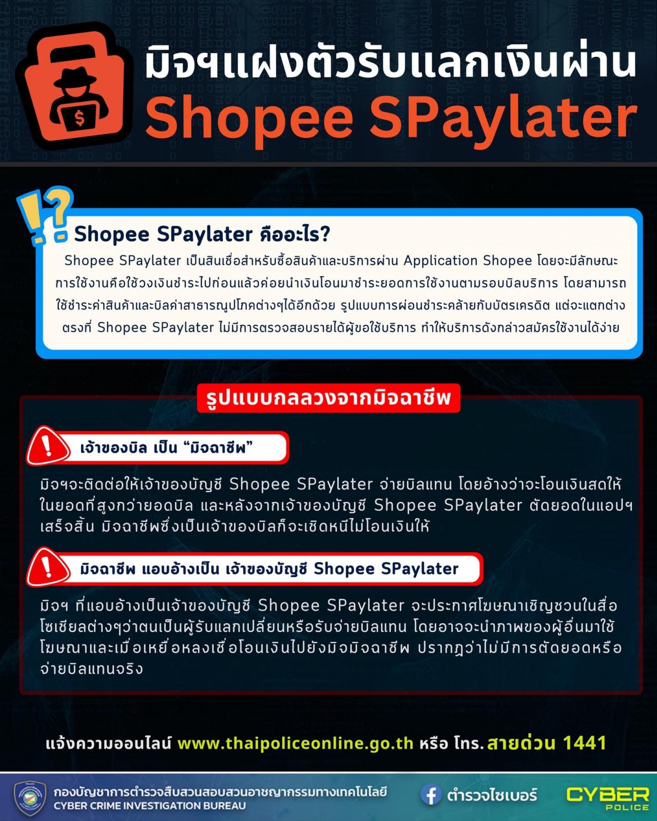 8 พ.ค. 2567 16:39:51🚨ระวังมุขใหม่มิจฉาชีพแฝงตัวรับแลกเงินผ่าน Shopee SPaylater . Shopee SPaylater เป็นบริการวงเงินสินเชื่อสำหรับซื้อสินค้าและบริการผ่าน Application Shopee รวมไปถึงสามารถชำระบิลค่าบริการสาธารณูปโภคต่างๆ ด้วยวงเงินดังกล่าวได้อีกด้วย โดยจะมีลักษณะการใช้งานคือใช้วงเงินชำระไปก่อนแล้วค่อยนำเงินสดโอนชำระยอดตาม...