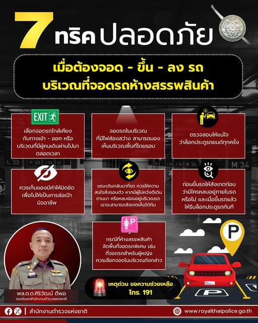 9 พ.ค. 2567 13:05:05📣สำนักงานตำรวจแห่งชาติ แนะนำ 7 ข้อควรปฏิบัติ ในการจอด และ ขึ้น-ลงรถ ภายในที่จอดรถห้างสรรพสินค้า . พล.ต.ต.ศิริวัฒน์ ดีพอ รองโฆษกสำนักงานตำรวจแห่งชาติ กล่าวว่า พล.ต.อ.กิตติ์รัฐ พันธุ์เพ็ชร์ รอง ผบ.ตร. รักษาราชการแทน ผบ.ตร. ได้มีความห่วงใยพี่น้องประชาชนที่อาจได้รับความเสียหายจากอาชญากรรมรูปแบบต่าง ๆ แ...