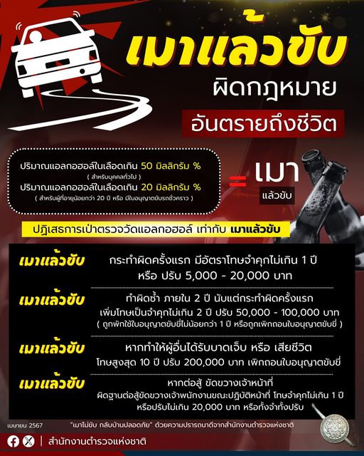 29 เม.ย. 2567 13:29:23🚨เมาแล้วขับ ผิดกฎหมาย อันตรายถึงชีวิตตนเอง และผู้อื่น 🚫แอลกอฮอล์แค่ไหน = เมาแล้วขับ ปริมาณแอลกอฮอล์ในเลือดเกิน 50 มิลลิกรัม % ( สำหรับบุคคลทั่วไป ) ปริมาณแอลกอฮอล์ในเลือดเกิน 20 มิลลิกรัม % ( สำหรับผู้ที่อายุน้อยกว่า 20 ปี หรือ มีใบอนุญาตขับรถชั่วคราว ) ⚠️หากปฏิเสธการเป่าตรวจวัดแอลกอฮอล์ เท่ากับ เ...