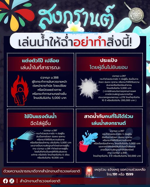 11 เม.ย. 2567 19:06:22สงกรานต์ 2567 เล่นน้ำให้ฉ่ำ 💦💦 ... อย่าทำสิ่งนี้ ‼️ อย่าแต่งตัวโป๊ หรือเปลือย เล่นน้ำในที่สาธารณะ อย่าประแป้ง โดยผู้อื่นไม่ยินยอม อย่าใช้ปืนแรงดันน้ำฉีดใส่ผู้อื่น อย่าสาดน้ำกับคนที่ไม่ได้ร่วมเล่นน้ำสงกรานต์ เข้าข่ายความผิดตามกฎหมายอาญา ต้องโทษทั้งจำคุก - ปรับ หรือ ทั้งจำทั้งปรับ เล่นน้ำสงกรานต์ ส...