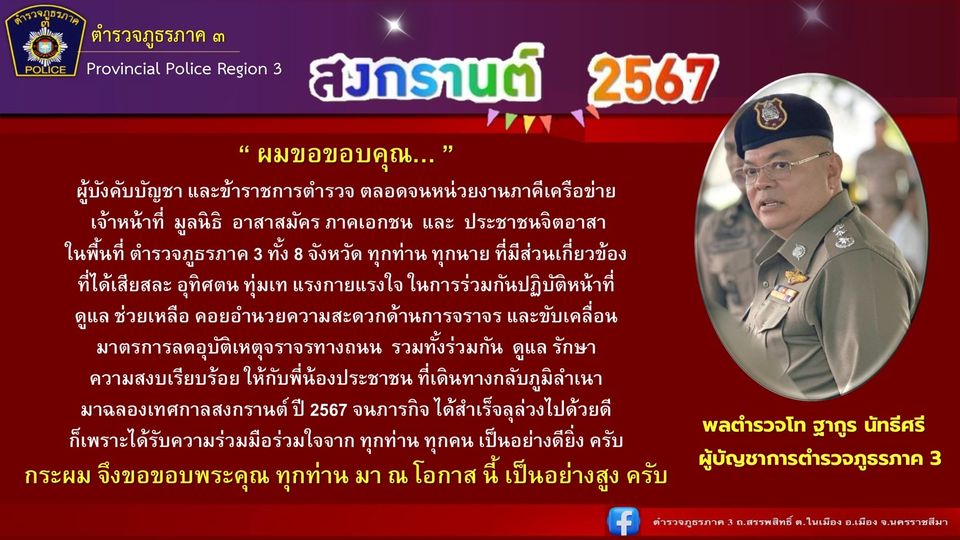 18 เม.ย. 2567 14:04:11" ผมขอขอบคุณ... " ผู้บังคับบัญชา และข้าราชการตำรวจ ตลอดจนหน่วยงานภาคีเครือข่าย เจ้าหน้าที่ มูลนิธิ อาสาสมัคร ภาคเอกชน และ ประชาชนจิตอาสา ในพื้นที่ ตำรวจภูธรภาค 3 ทั้ง 8 จังหวัด ทุกท่าน ทุกนาย ที่มีส่วนเกี่ยวข้อง . ที่ได้เสียสละ อุทิศตน ทุ่มเท แรงกายแรงใจ ในการร่วมกันปฏิบัติหน้าที่ ดูแล ช่วยเหลือ คอ...