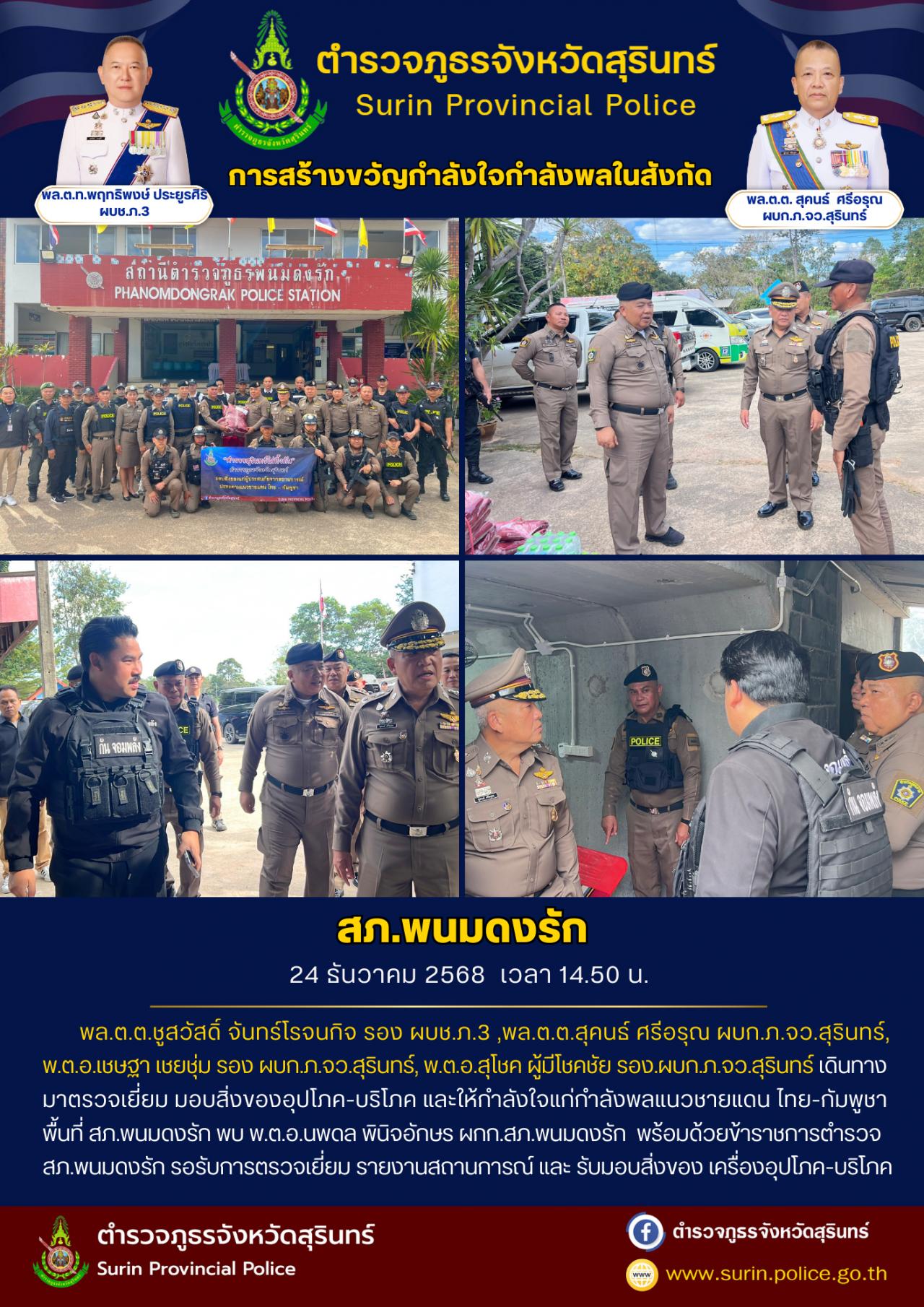 24 ธ.ค. 2568 20:11:50 วันนี้(24 ธ.ค.68) เวลา 14.50น. ตรวจเยี่ยม มอบสิ่งของอุปโภค-บริโภค และให้กำลังใจแก่กำลังพลแนวชายแดน ไทย-กัมพูชา พื้นที่ สภ.พนมดงรัก พล.ต.ต.ชูสวัสดิ์ จันทร์โรจนกิจ รอง ผบช.ภ.3 ,พล.ต.ต.สุคนธ์ ศรีอรุณ ผบก.ภ.จว.สุรินทร์,พ.ต.อ.เชษฐา เชยชุ่ม รอง ผบก.ภ.จว.สุรินทร์, พ.ต.อ.สุโชค ผู้มีโชคชัย รอง.ผบก.ภ.จว...