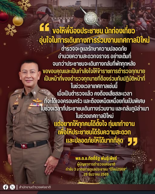 29 ธ.ค. 2568 11:33:41📍"ผบ.ตร." ย้ำขอให้พี่น้องประชาชน นักท่องเที่ยว อุ่นใจในการเดินทาง การร่วมงานเทศกาลปีใหม่ พร้อมให้กำลังใจ "ตำรวจ" ทุกนายดูแลประชาชนอย่างเต็มที่ . พล.ต.อ.กิตติ์รัฐ พันธุ์เพ็ชร์ ผู้บัญชาการตำรวจแห่งชาติ ขอให้พี่น้องประชาชน นักท่องเที่ยว อุ่นใจในการเดินทาง การร่วมงานเทศกาลปีใหม่ "ตำรวจจะดูแลรักษาความปล...